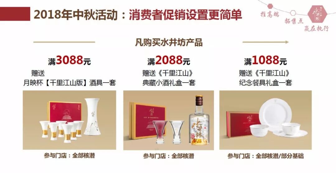 对于即将到来的中秋会战乃至下半年的市场争夺,水井坊究竟要如何打?记者从水井坊某核心市场了解到:水井坊基于在该市场的现实状况,提出“推高端、拓售点、赢在执行”的营销策略。具体而言,高端主要围绕打造明星店、开高端品鉴会和做圈层营销;拓售点则聚焦基础门店开拓和空白市场开发;而执行力提升是通过培训提升团队素质和增加一线人员数量等方式。